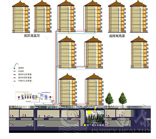整個(gè)水處理過程即對(duì)自來水進(jìn)行深度處理通過精濾過濾器過濾、軟化、膜(RO反滲透)分離、臭氧殺菌等過程,去除水中有害重金屬、有機(jī)物、細(xì)菌及病毒等雜質(zhì),使其成為優(yōu)質(zhì)飲用凈水(純凈水)通過專設(shè)的特種衛(wèi)生管道直接送入每家每戶,供居民使用,與原有的自來水徹底分開,原自來水成為日雜用水。